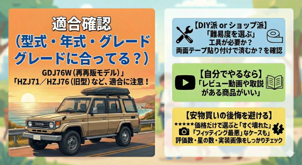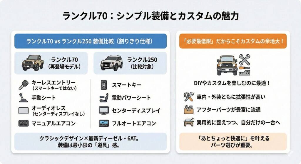 結論、ランクル70の「不便さ」を楽しみに変え、より快適で満足度の高いカーライフを実現し、無骨なランクル70を「自分だけの愛車」に育てる第一歩が踏みだせます。